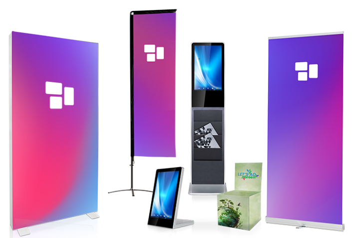 Von klassischen Rollup-Systemen und Werbeschildern über nachhaltige Pappaufsteller und digitale Stelen bis hin zu
