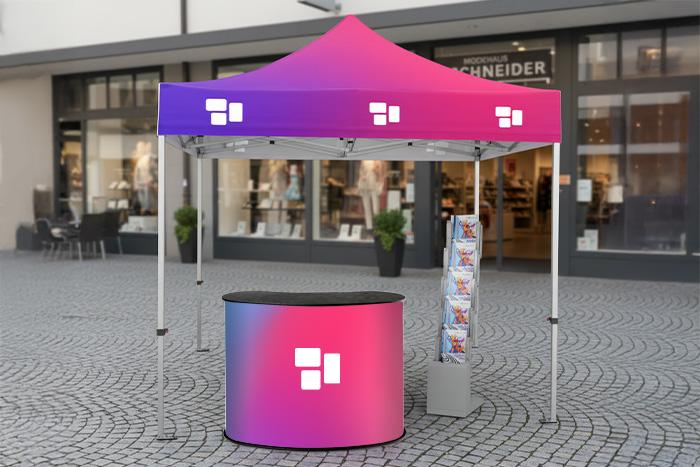 Die optimale Basis für Ihre Promo-Aktion: Das Infostand Set S kombiniert ein standsicheres Faltzelt in 3 x 3 Meter, eine großzügige Theke und einen faltbaren Prospektständer - perfekt für Outdoor-Events und Promotions.