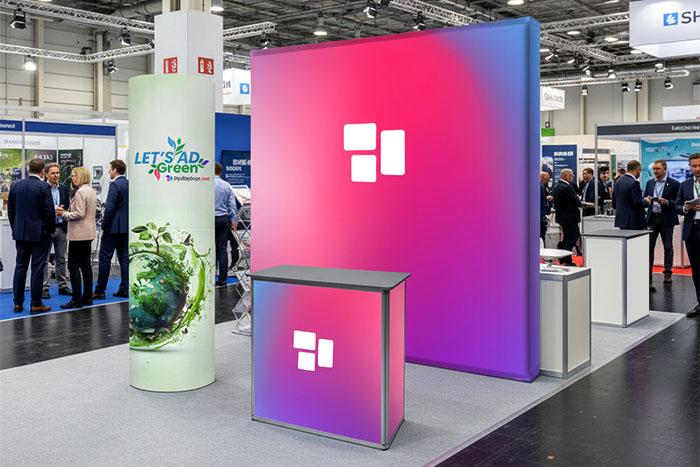 Unser kompaktes Messestand Set S ist die ideale Budget-Lösung für kleinere Präsentationsflächen - mit Textilfaltdisplay, Theke und Aufsteller. Individuell bedruckt, schnell aufgebaut und einfach zu transportieren.