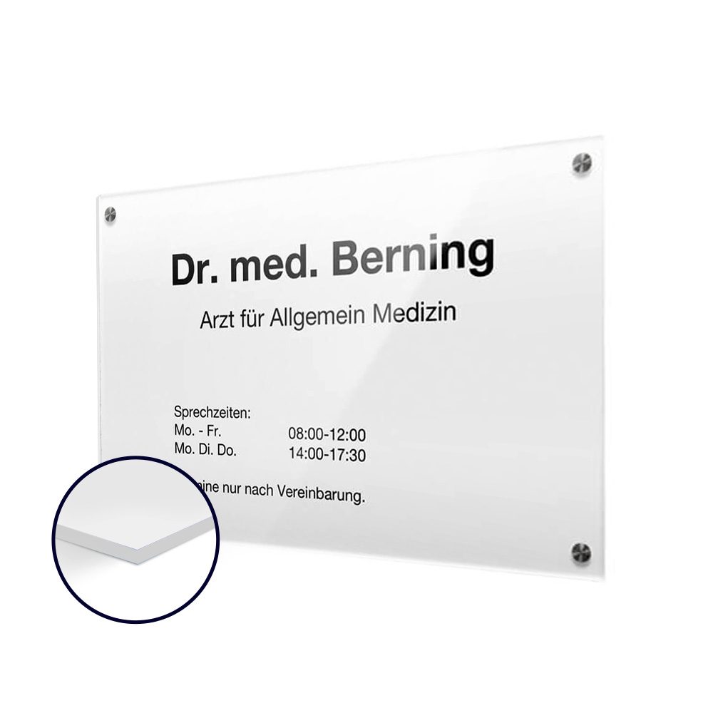 In Hinblick auf die verfügbaren Materialien für Ihr online konfigurierbares Praxisschild setzen wir auf einen hohen Qualitätsstandard, der sich sehen lassen kann. Ihr favorisiertes Druckdesign platzieren wir entweder auf 3 mm dickem Acrylglas oder alternativ auf ebenso so starkem Alu-Dibond. Beide Grundlagen stehen für eine licht- und witterungsbeständige sowie kratzfeste Oberfläche, die sich mittels zeitgemäßem UV-Direktdruck nachhaltig und farbstark bedrucken lässt. Unsere günstigen Praxisschilder sind obendrauf leicht zu reinigen. Gerne fügen wir Ihrem bedruckten Praxisschild bei Bedarf auch optionale Aufhängevorrichtungen zur simplen Montage hinzu. Ihre Wahl treffen Sie hierbei zwischen Bohrungen mit mindestens 6 mm Durchmesser oder aber Edelstahlabstandshaltern. Egal ob Arzt-Praxis, Praxis für Psychotherapie, Heilpraktiker-Praxis, Tierarzt-Praxis oder auch Zahnarzt-Praxis – Bestellen Sie Ihr günstiges Praxisschild mit Digitaldruck online und profitieren Sie direkt von Ihrem formschönen „Eyecatcher“.
